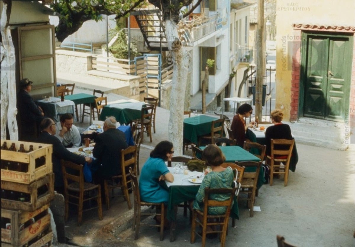 Στη φωτογραφία που έχει τραβηχτεί από τον φωτογράφο Bob van Dam (Ολλανδικό Φωτογραφικό Μουσείο) βλέπετε την οδό Ερωτοκρίτου στην Πλάκα και την ταβέρνα του ΨΑΡΑ (1968-1971).