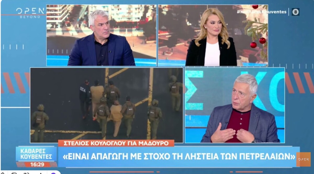 «Εγινε διάρρηξη και απαγωγή των ενοίκων, με στόχο τη ληστεία του πετρελαίου», συνόψισε ο Στέλιος Κούλογλου τις εξελίξεις στη Βενεζουέλα, μιλώντας στο Open (Σπύρος Χαριτάτος- Αλεξάνδρα Χατζηγεωργίου) και στο κανάλι των Ιωαννίνων ITV (Βλάσης Ντόκας).