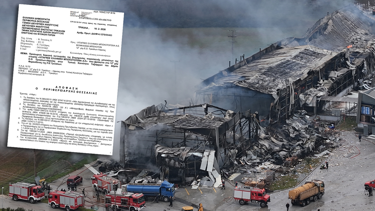 «Διακόπτουμε προσωρινά τη λειτουργία της βιομηχανίας της εταιρείας «VITAFREE ΕΛΛΗΝΙΚΗ ΜΠΙΣΚΟΤΟΠΟΙΙΑ Α.Ε», που βρίσκεται 12ο χλμ. Ε.Ο. Τρικάλων – Λάρισας στην Τοπική Κοινότητα Ταξιαρχών του Δήμου Φαρκαδόνας της Π.Ε Τρικάλων, και συγκεκριμένα του μηχανολογικού εξοπλισμού της παραγωγικής διαδικασίας (γραμμές παραγωγής και εγκαταστάσεις υγραερίου) σύμφωνα με το άρθρο 29 παρ.1 και 2 του Ν.3982/2011, επειδή κρίνουμε ότι προκαλείται άμεσος κίνδυνος για την ασφάλεια των εγκαταστάσεων και των εργαζομένων, λόγω μη ύπαρξης πιστοποιητικών ελέγχου δεξαμενών σε ισχύ, και μη ύπαρξης πιστοποιητικού πυροπροστασίας ή αποδεικτικού αρχειοθέτησης μελέτης πυροπροστασίας.