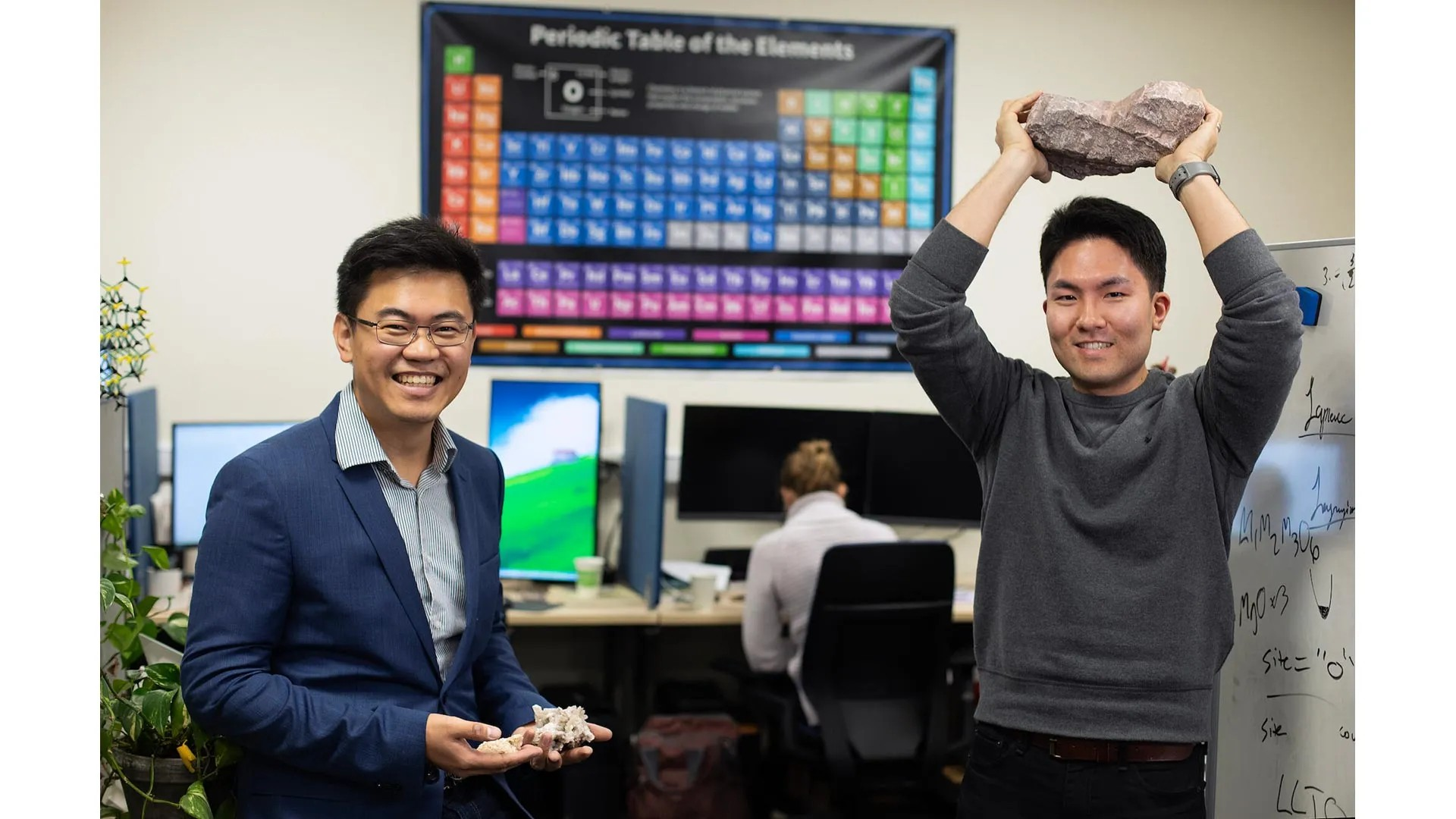 Ο Wenhao Sun, καθηγητής της έδρας Dow Early Career Assistant Professor στην Επιστήμη και Μηχανική Υλικών στο Πανεπιστήμιο του Μίσιγκαν, και ο Joonsoo Kim, διδακτορικός φοιτητής στην ίδια σχολή και μέλος της ερευνητικής ομάδας του καθηγητή Sun, παρουσιάζουν δείγματα δολομίτη από τη συλλογή του εργαστηρίου τους.