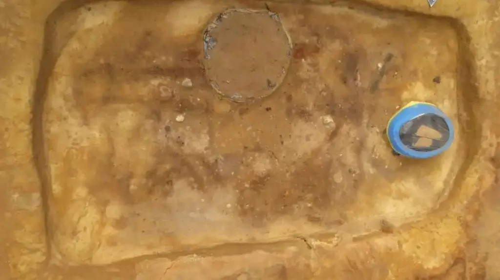 Ο ανασκαμμένος τύμβος που δείχνει τους δύο τάφους, έναν για τους δύο ανθρώπους υψηλής κοινωνικής θέσης και έναν άλλο για το άλογό τους. Φωτογραφία: BBC