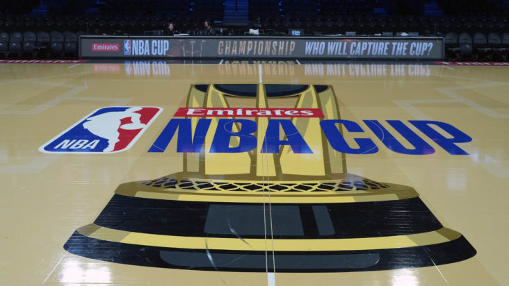 Dec 16, 2025; Las Vegas, Nevada, USA; The Emirates NBA Cup logo at midcourt at T-Mobile Arena. Mandatory Credit: Kirby Lee-Imagn Images