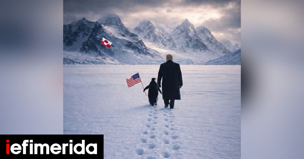 Στην εικόνα που δημοσιεύτηκε, ο Ρεπουμπλικανός πρόεδρος εμφανίζεται να κατευθύνεται προς μια παγωμένη οροσειρά, όπου δεσπόζει η σημαία της Γροιλανδίας. Δίπλα του, ωστόσο, απεικονίζεται ένας πιγκουίνος που κρατά την αμερικανική σημαία, ενώ το μήνυμα που συνοδεύει την ανάρτηση αναγράφει: «Αγκαλιάστε τον πιγκουίνο».