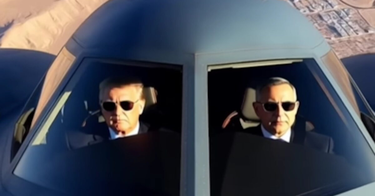 Ο Νετανιάχου «πιλοτάρει» ένα βομβαρδιστικό B-2, σαν και αυτά που χρησιμοποιήθηκαν στην επίθεση στις πυρηνικές εγκαταστάσεις του Ιράν, μαζί με τον Ντόναλντ Τραμπ. Και οι δύο φορούν μαύρα γυαλιά και κουστούμι ενώ τους δροσίζει ένα αεράκι που φυσά μέσα στο πιλοτήριο.