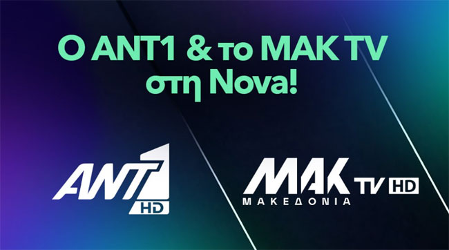 Από την Δευτέρα 2 Φεβρουαρίου όλοι οι συνδρομητές της Nova θα απολαμβάνουν το αγαπημένο πρόγραμμα του ANT1 σε ανάλυση HD (στη θέση 8 μέσω Internet με δυνατότητα catch-up 7 ημερών και στη θέση 108 μέσω δορυφόρου) και του MAK TV σε ανάλυση HD (στη θέση 12 μέσω Internet με δυνατότητα catch-up 7 ημερών και 112 μέσω δορυφόρου).