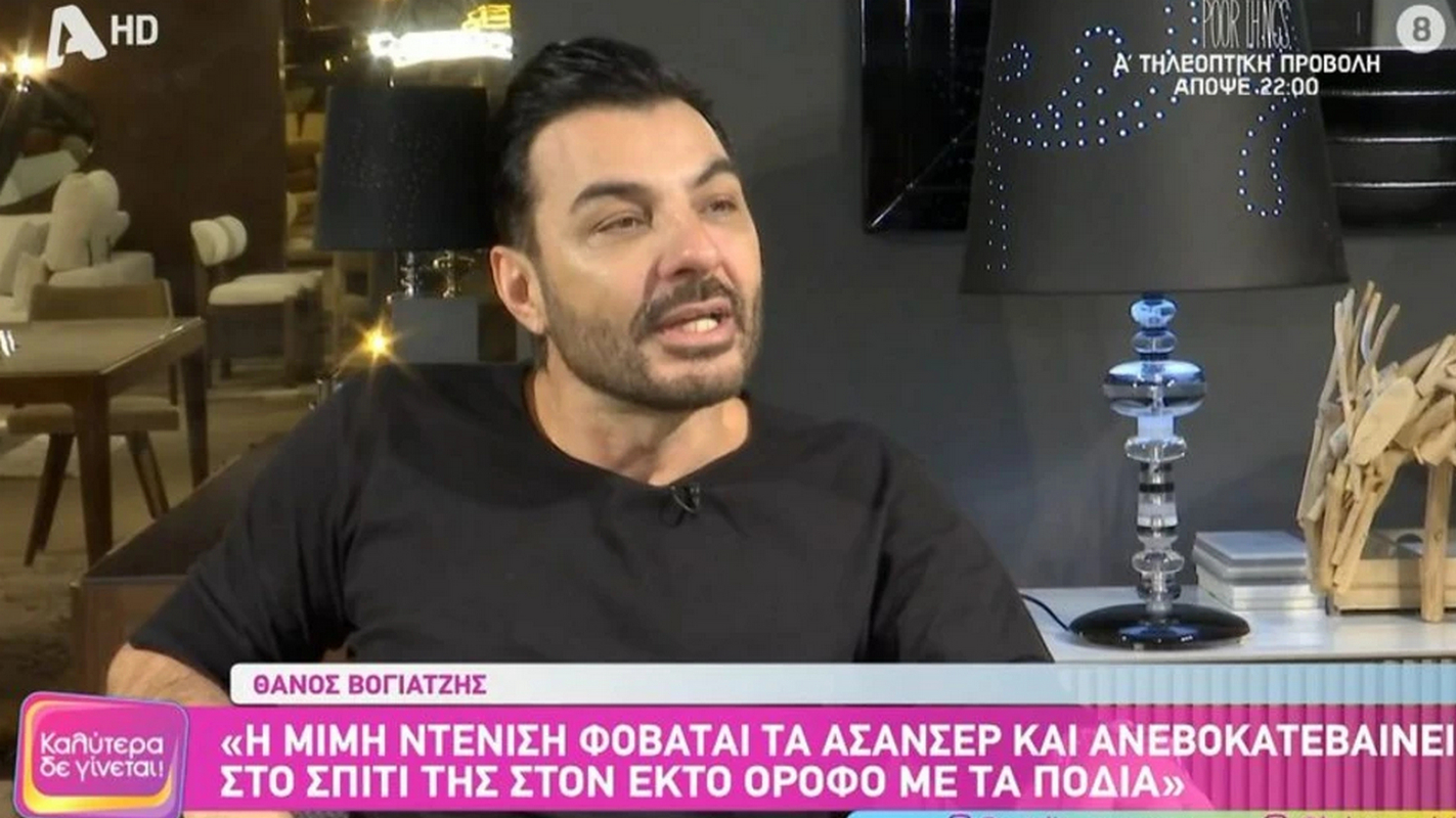 Τέλος δήλωσε εντυπωσιασμένος από τη στοχοπροσήλωση της Μιμής Ντενίση, το «πόσο τη νοιάζει η δουλειά της», ενώ αποκάλυψε ότι φοβάται τα ανσασέρ και γι’ αυτό ανεβοκατεβαίνει στον 6ο όροφο που μένει με τα πόδια.