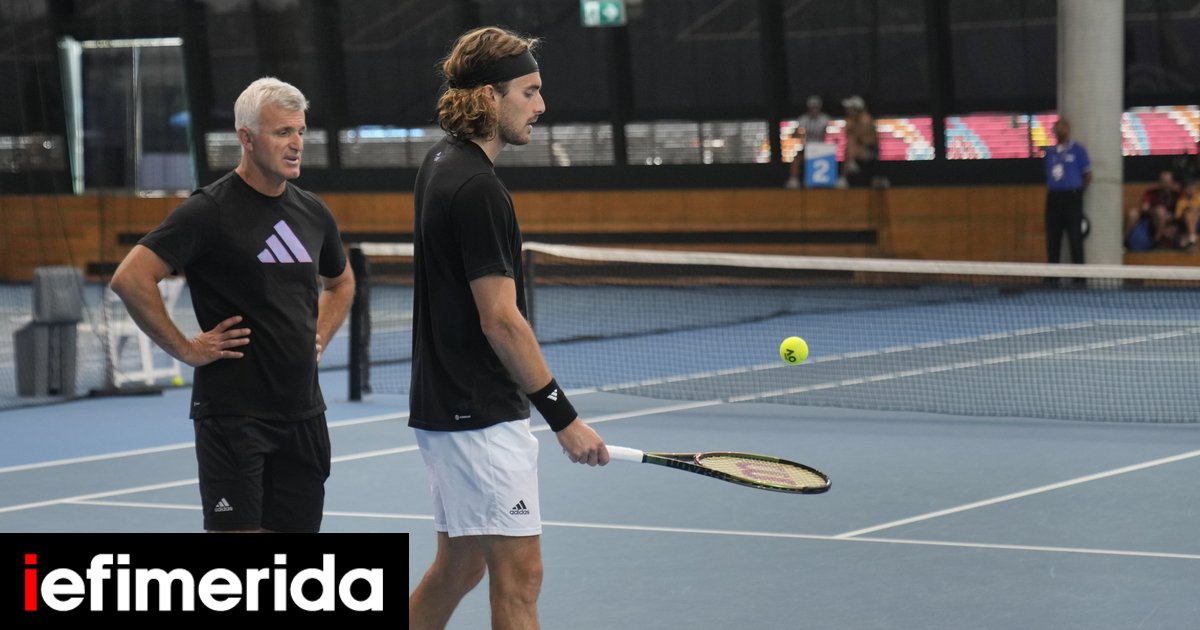 Ο Στέφανος Τσιτσιπάς προπονείται μαζί με τον πατέρα του, Απόστολο / Φωτογραφία αρχείου: AP Photo/Dita Alangkara