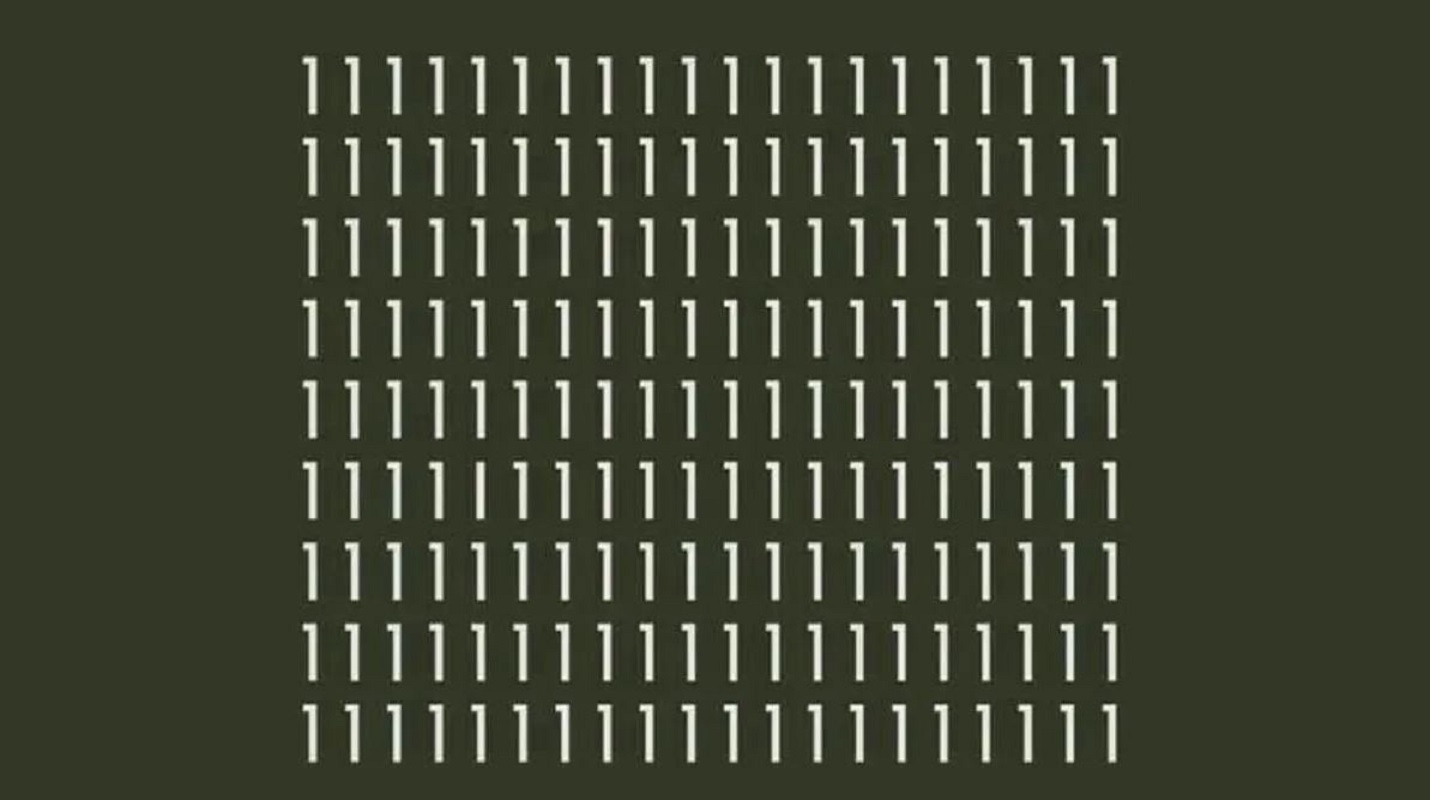 Αυτή η έξυπνη οπτική ψευδαίσθηση δείχνει ένα πλέγμα γεμάτο με το ψηφίο 1, αλλά υπάρχει ένα μόνο γράμμα Ι που κρύβεται σε κοινή θέα. Μόνο άτομα με πραγματικά οξεία όραση και «μάτι γερακιού» είναι πιθανό να εντοπίσουν το γράμμα σε λιγότερο από 9 δευτερόλεπτα. Είστε έτοιμοι να λύσετε αυτή τη διασκεδαστική και δύσκολη οπτική ψευδαίσθηση;
