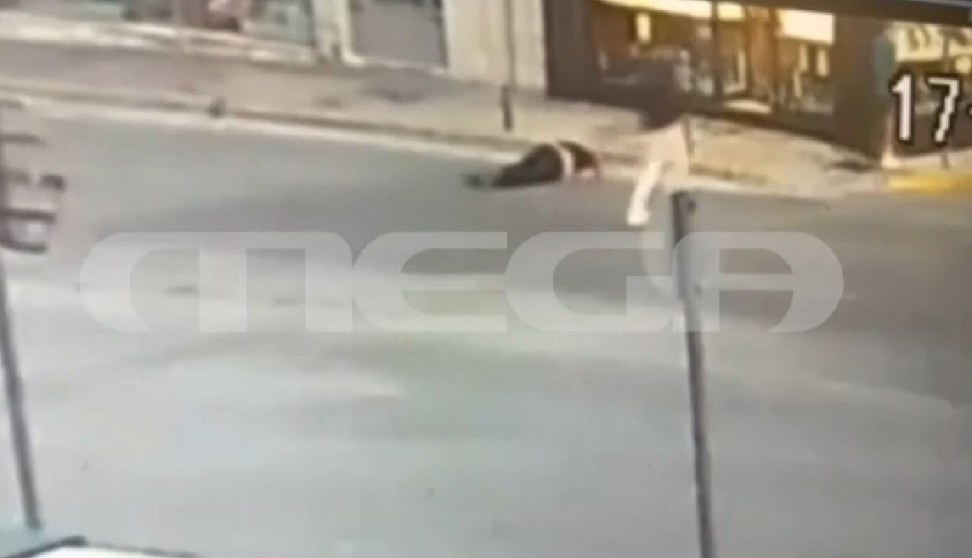 Σε βίντεο του Mega, φαίνεται η στιγμή που ο πελάτης έχει βγάλει έξω από το μαγαζί τον κοσμηματοπώλη, τον έχει ρίξει στη μέση του δρόμου και τον κλωτσάει.