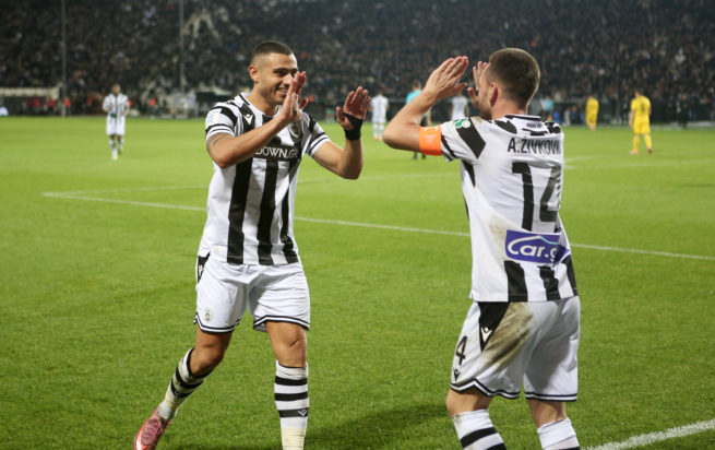 Το σκορ του αγώνα άνοιξε στο 28′, με τους “ασπρόμαυρους” να πανηγυρίζουν. Εξαιρετική ενέργεια του Ζίβκοβιτς, σέντρα από τα δεξιά, πανέμορφη εκτέλεση του Τάισον, ο οποίος με γυριστό σουτ έστειλε την μπάλα στα δίχτυα της εστίας του Άρης. Τέταρτο γκολ στη σεζόν για τον Βραζιλιάνο εξτρέ, πέμπτη ασίστ για τον Σέρβο.