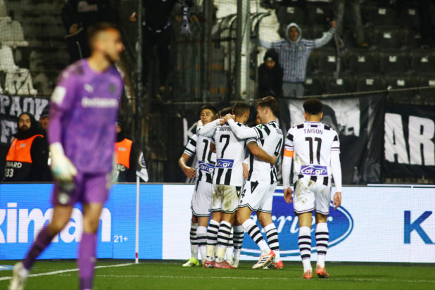 Από το ξεκίνημα του αγώνα οι «ασπρόμαυροι» πήραν την κατοχή της μπάλας, χωρίς όμως να μπορούν να δημιουργήσουν σημαντικές φάσεις. Ευτύχησαν, όμως, να ανοίξουν το σκορ στο 18’. Ο Δημήτρης Χατσίδης σούταρε εκτός περιοχής, ο Νίκος Χριστογεώργος δεν απέκρουσε πειστικά κι ο επερχόμενος Πέλκας με πλασέ από δύσκολη γωνία έστειλε την μπάλα στα δίχτυα για το 1-0.