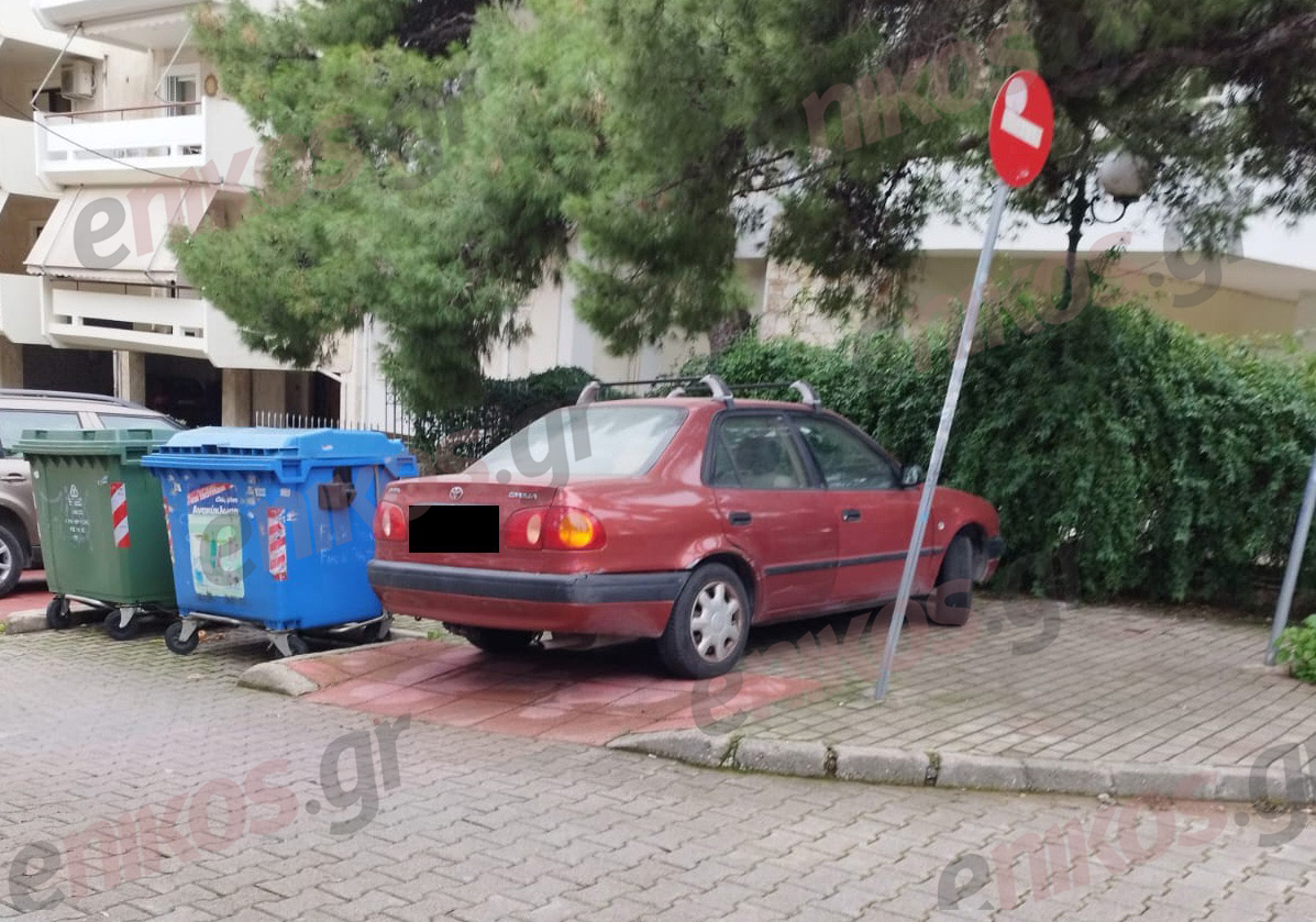Το όχημα έχει «κολλήσει» ακριβώς δίπλα στους κάδους απορριμμάτων και ανακύκλωσης, καθιστώντας σχεδόν αδύνατη την πρόσβαση των πολιτών στο πεζοδρόμιο.