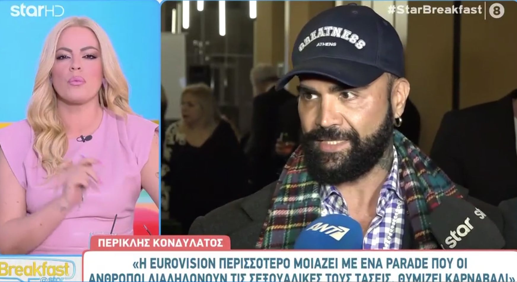 Αντιδράσεις προκαλεί η δήλωση του Περικλή Κονδυλάτου σε πρωινή εκπομπή του STAR για τη Eurovision, ότι του μοιάζει περισσότερο με «καρναβαλική παρέλαση» ανθρώπων για να διαδηλώσουν τις σεξουαλικές τους τάσεις.