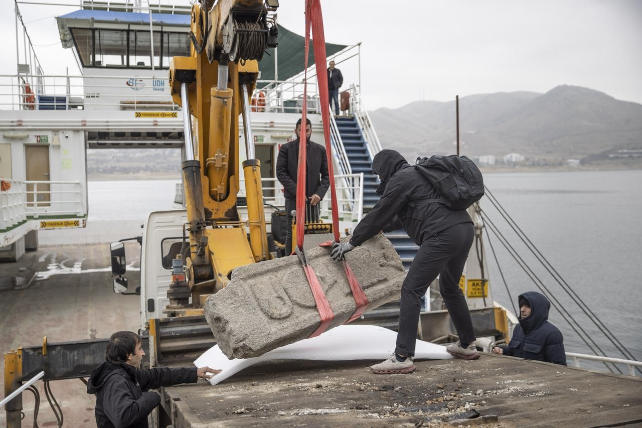 Εργάτες χρησιμοποιούν γερανό φορτωμένο σε πλοίο (φέρι μποτ) για να ανυψώσουν ένα βαρύ θραύσμα σαρκοφάγου που αναδύθηκε αφού υποχώρησαν τα νερά της λίμνης του φράγματος Keban κοντά στο φρούριο Pertek στην Tunceli της Τουρκίας, 11 Δεκεμβρίου 2025. Φωτογραφία:ΑΑ