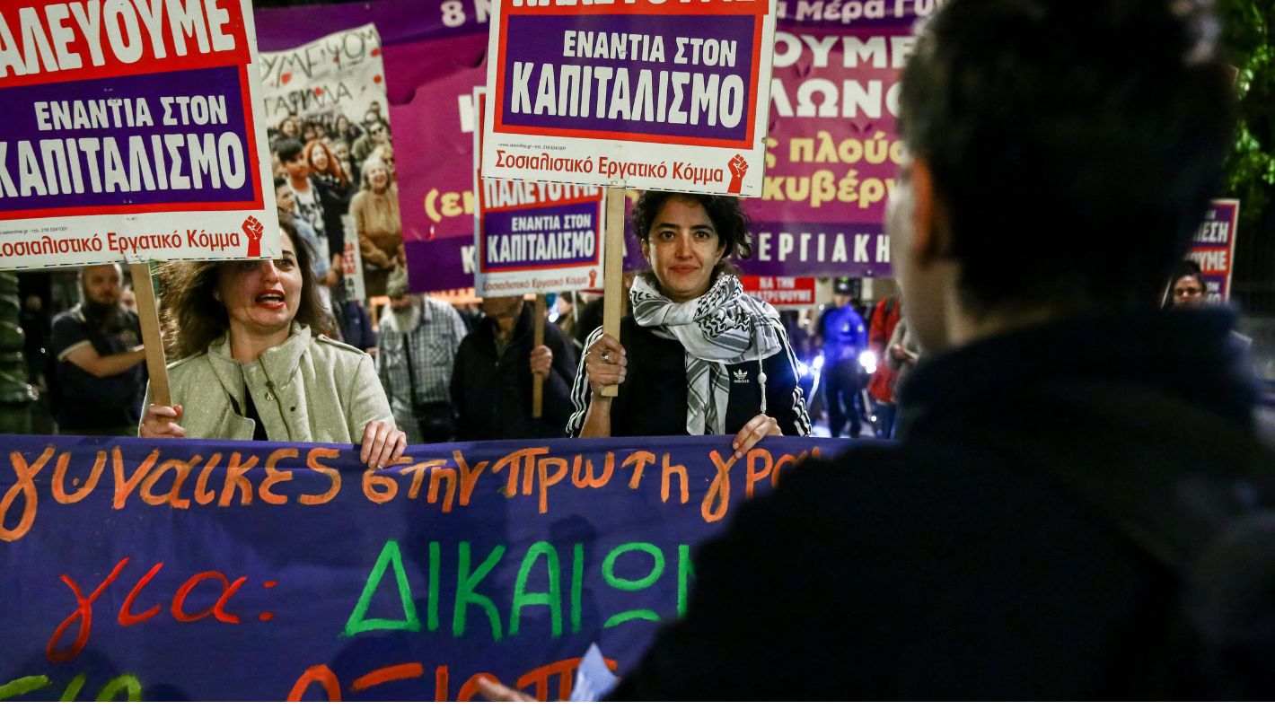 Με συνθήματα όπως «Η πατριαρχία βιάζει και σκοτώνει. Στο δρόμο και στο σπίτι, ποτέ καμία μόνη», γέμισαν τους δρόμους της Αθήνας, διαδηλώνοντας ταυτόχρονα υπέρ της Παλαιστίνης και κατά του Καπιταλισμού.