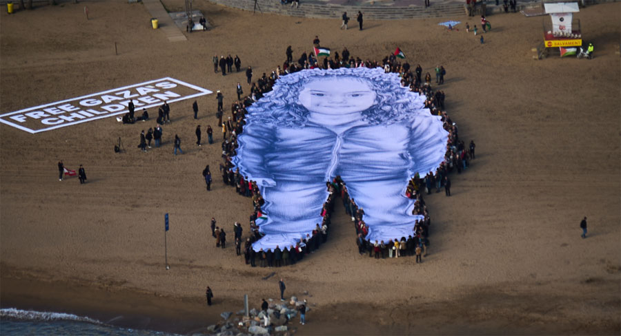 Τεράστιο πορτρέτο της 5χρονης Παλαιστίνιας Χιντ Ρατζάμπ ξεδίπλωσαν διαδηλωτές σε παραλία της Βαρκελώνης, δύο χρόνια μετά τον θάνατό της στον πόλεμο στη Γάζα… Συγκεκριμένα εκατοντάδες άνθρωποι κρατούσαν έναν τεράστιο μουσαμά μήκους 55 μέτρων με το πρόσωπο της Ρατζάμπ, δίπλα σε μια μεγάλη παλαιστινιακή σημαία και το μήνυμα «Ελευθερία στα Παιδιά της Γάζας».