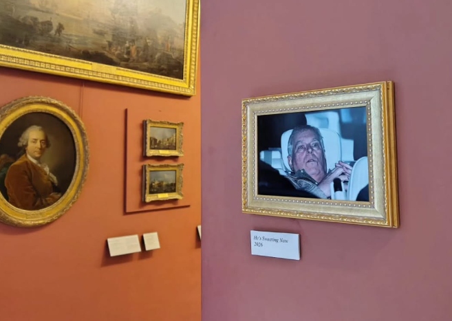Την Κυριακή (22/2), η βρετανική αντικαπιταλιστική/αντιδισεκατομμυριούχων ομάδα Everyone Hates Elon τοποθέτησε τη φωτογραφία σε τοίχο του διάσημου γαλλικού μουσείου, συνοδεύοντάς τη με τη λεζάντα «He’s Sweating Now» («Τώρα ιδρώνει») – αναφορά στη «επιπέδου πυρηνικής έκρηξης κακή» συνέντευξη του 2019 στο Newsnight με την Έμιλι Μέιτλις, κατά την οποία ο πρώην πρίγκιπας είχε ισχυριστεί ότι δεν μπορεί να ιδρώσει και συνεπώς η κατήγορος Βιρτζίνια Τζιούφρι έλεγε ψέματα όταν ανέφερε ότι τον είδε να ιδρώνει σε νυχτερινό κλαμπ.