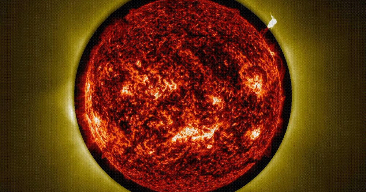 «Μερικές φορές παρατηρούμε αυτές τις δομές, γνωστές ως προεξοχές, κοντά στην επιφάνεια του Ήλιου. Αν και θερμές για τα ανθρώπινα δεδομένα, είναι πολύ πιο κρύες από το περιβάλλον στέμμα», σημειώνει ο Zhukov. Το time-lapse κατέγραψε κάτι σπάνιο: τρεις διαδοχικές εκρήξεις τέτοιων προεξοχών μέσα σε διάστημα μόλις πέντε ωρών. Το φαινόμενο, όπου το πλάσμα εκτοξεύεται και διασπάται προς διάφορες κατευθύνσεις, αποτυπώθηκε χάρη στη φασματική γραμμή του ηλίου, προσφέροντας μια εικόνα που προσομοιάζει στο πώς θα έβλεπε το ανθρώπινο μάτι μια ολική έκλειψη ηλίου μέσω ενός κίτρινου φίλτρου.