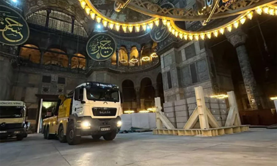 Πρωτοφανείς εικόνες με φορτηγά και γερανοφόρα μέσα στην Αγιά Σοφιά