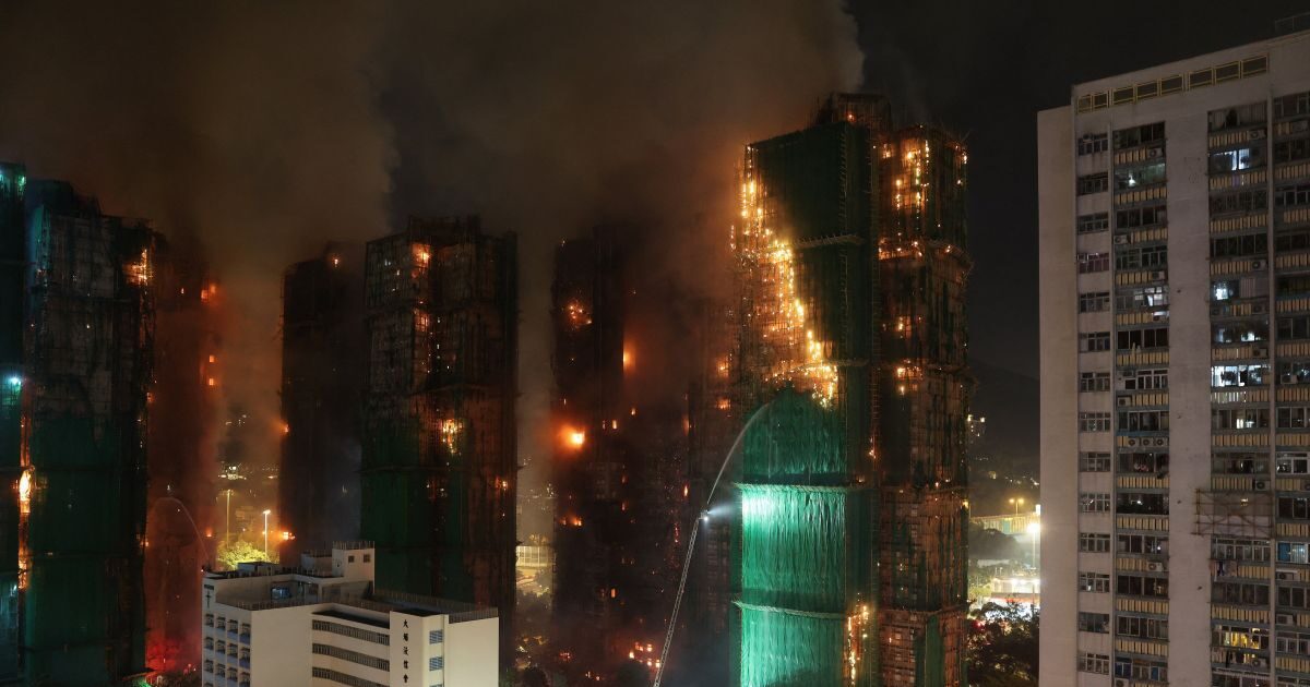 Πυροσβέστες αγωνίζονταν για την κατάσβεση της πυρκαγιάς, ενώ πυκνός μαύρος καπνός υψωνόταν πάνω από τους πύργους των 31 ορόφων, με τις φλόγες να φωτίζουν τον νυχτερινό ουρανό. Το κτιριακό συγκρότημα Wang Fuk Court αποτελείται από οκτώ κτίρια που περιλαμβάνουν σχεδόν 2.000 διαμερίσματα.