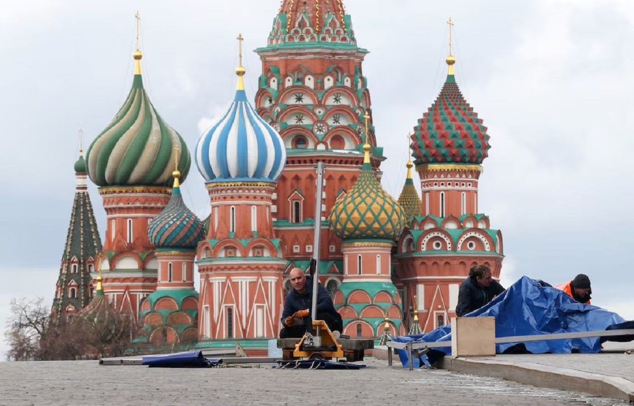 Εργάτες στήνουν σκηνή ενόψει της παρέλασης για την Ημέρα της Νίκης, που τιμά την επέτειο της νίκης επί της ναζιστικής Γερμανίας στον Β’ Παγκόσμιο Πόλεμο, στην Κόκκινη Πλατεία κοντά στον ναό του Αγίου Βασιλείου, στο κέντρο της Μόσχας, Ρωσία, 29 Απριλίου 2026. (REUTERS/Ramil Sitdikov)