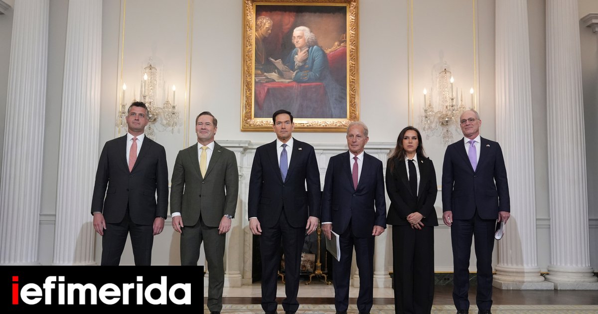 O Ρούμπιο με τους εκπροσώπους του Ισραήλ και του Λιβάνου / Φωτογραφία: AP