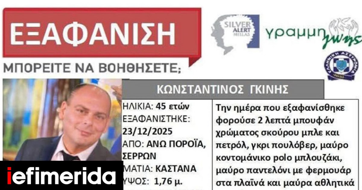 Συνεχίζεται το θρίλερ εξαφάνισης του διοικητή του Πυροσβεστικού Κλιμακίου Πορροΐων Σερρών, ο οποίος αγνοείται από τις 23 Δεκεμβρίου, καθώς οι προσπάθειες εντοπισμού παραμένουν άκαρπες.