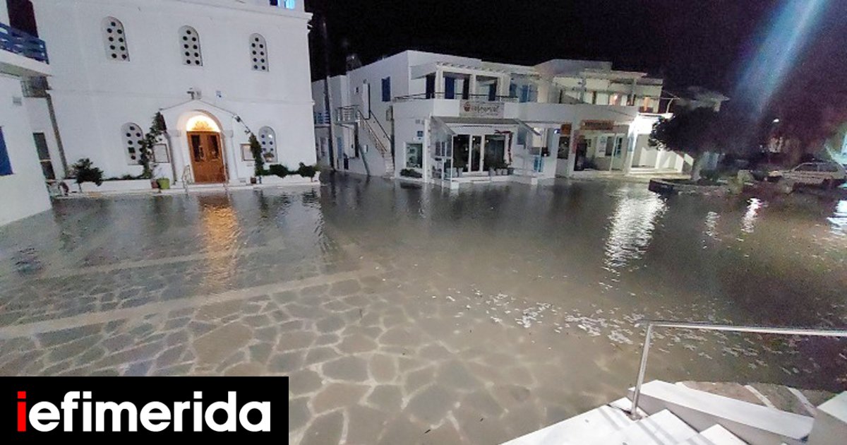 Στην Πάρο, η πλατεία Ζωοδόχου Πηγής στην Παροικιά και τμήματα της παραλιακής οδού πλημμύρισαν, ενώ θεόρατα κύματα έσκαγαν στο παραλιακό μέτωπο. Σύμφωνα με το parianotypos.gr, οχήματα έργου της Πυροσβεστικής και του Δήμου προχώρησαν σε άντληση υδάτων υπό την επίβλεψη τοπικών αρχών.