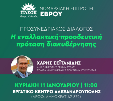 Ο Αναπληρωτής Γραμματέας του Τομέα Μικρομεσαίας του ΠΑΣΟΚ- Κινήματος Αλλαγής και Περιφερειακός Σύμβουλος της παράταξης «Μαζί για την Αλλαγή», Χάρης Σεϊτανίδης, θα παραβρεθεί στην Ολομέλεια του ΠΑΣΟΚ- Κινήματος Αλλαγής Ν. Έβρου που θα πραγματοποιηθεί την Κυριακή 11 Ιανουαρίου 2026 και ώρα 11:00π.μ. στην αίθουσα του πρώτου (1ου) ορόφου του Εργατικού Κέντρου Αλεξανδρούπολης επί της οδού Λ. Δημοκρατίας αρ. 372.