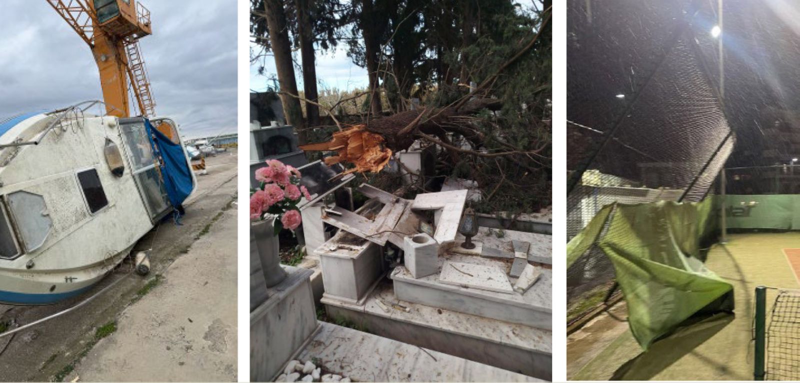 Πολλές ζημιές και στα Α’ νεκροταφεία, με δέντρα να έχουν πέσει πάνω σε τάφους προκαλώντας σημαντικές φθορές.