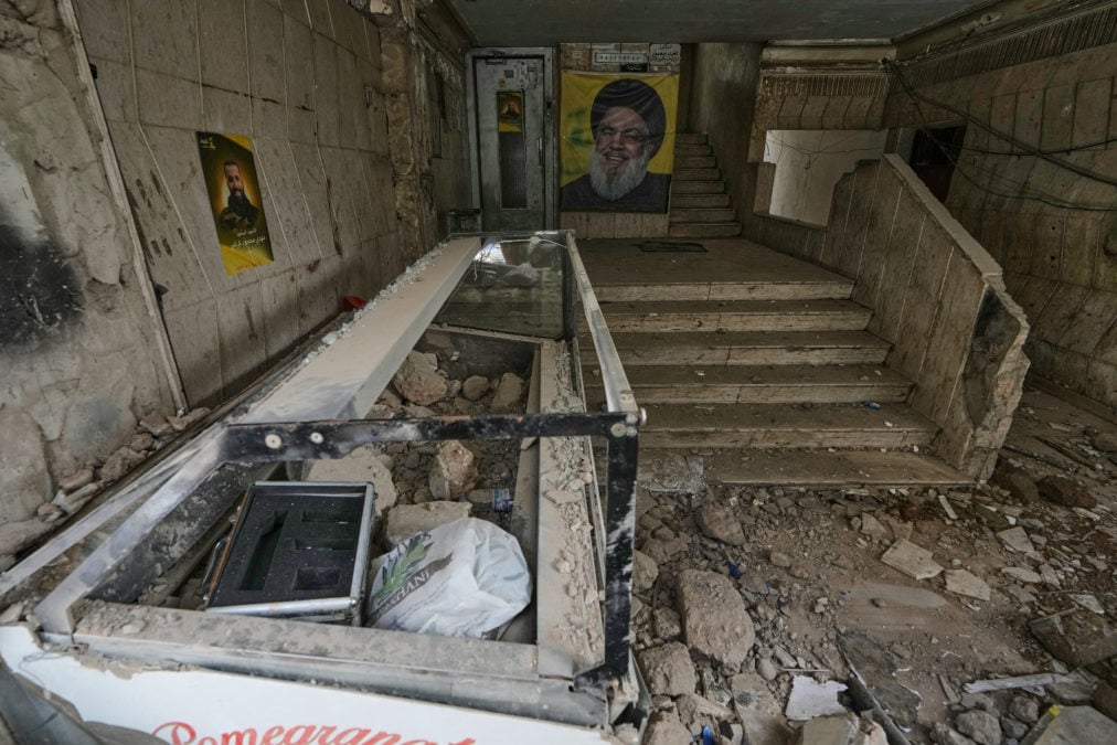Ένα πορτρέτο του εκλιπόντος ηγέτη της Χεζμπολάχ, Σαγιέντ Χασάν Νασράλα, στο κέντρο, κρέμεται στην είσοδο ενός κτιρίου που υπέστη ζημιές σε ισραηλινή αεροπορική επιδρομή στη Νταχίγιε, στα νότια προάστια της Βηρυτού, στον Λίβανο, Σάββατο 4 Απριλίου 2026. (AP Photo/Bilal Hussein)