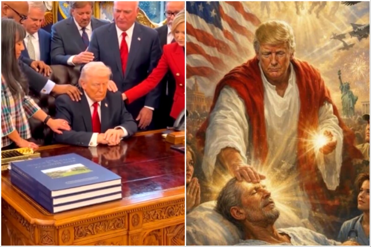 Χαρακτηριστική είναι και η πρόσφατη εικόνα του Τραμπ να προσεύχεται στον Λευκό Οίκο, περιβαλλόμενος από θρησκευτικούς ηγέτες που τοποθετούν τα χέρια τους πάνω του. Η πράξη αυτή, γνωστή ως «επίθεση των χειρών», συμβολίζει τη μεταβίβαση πνευματικής εξουσίας και ενισχύει την εικόνα του ως ηγέτη με θεϊκή αποστολή.