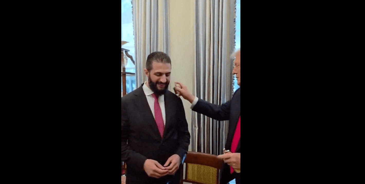 Στη συνέχεια, προσέφερε στον Πρόεδρο αλ-Σαράα και ένα γυναικείο άρωμα της σειράς, «για τη σύζυγό του» και τον ρώτησε «Πόσες γυναίκες εχεις;