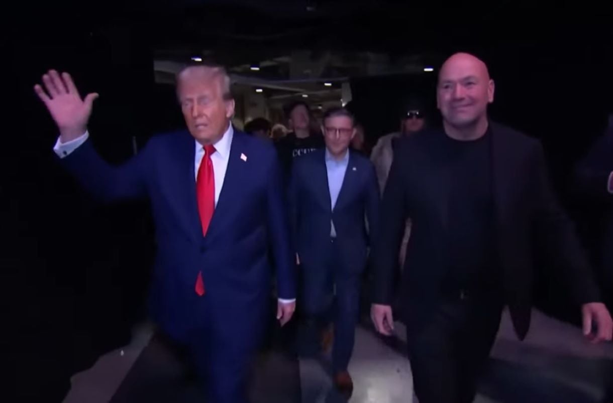 Ο Τραμπ έφτασε στον χώρο λίγο μετά τις 21:00 τοπική ώρα, συνοδευόμενος από τον πρόεδρο του UFC Ντέινα Γουάιτ και μέλη της οικογένειάς του. Υπό τους ήχους τραγουδιού του Kid Rock, κατευθύνθηκε στη θέση του, όπου τον περίμενε ήδη ο Μάρκο Ρούμπιο.