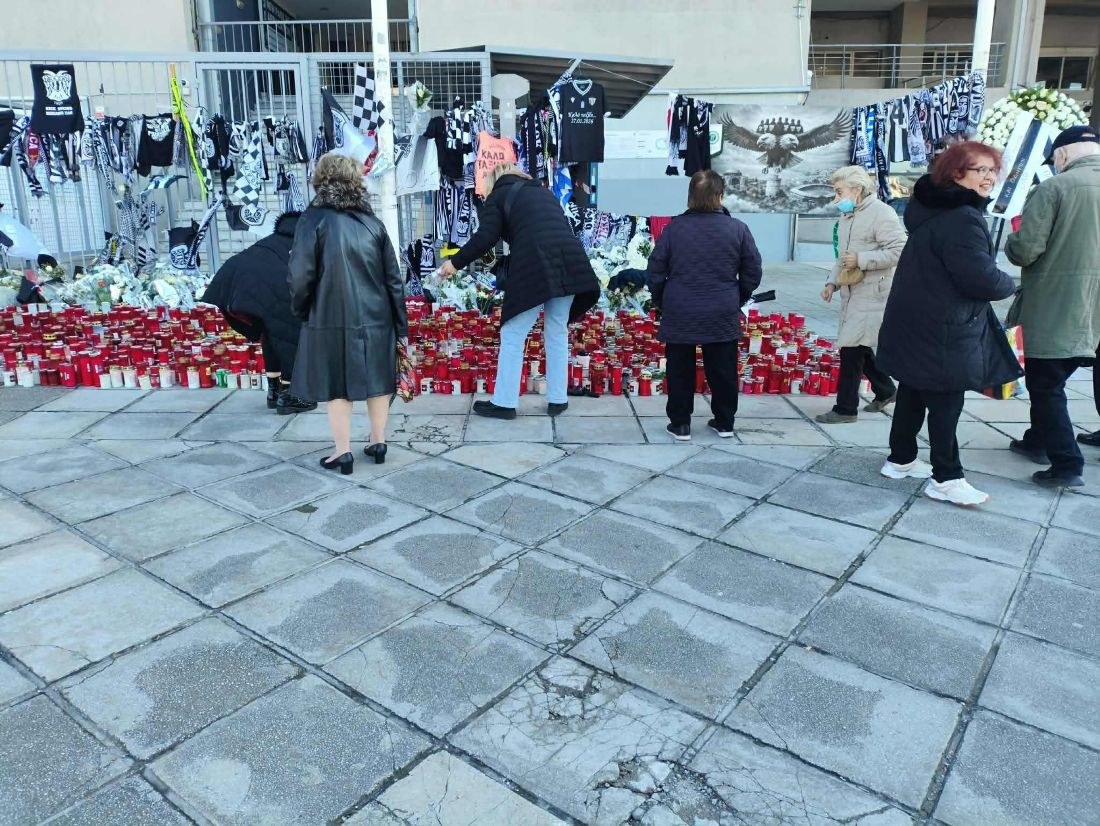 Από τη Χαλκιδική έως την Κοζάνη κι από την Καβάλα έως τα Τρίκαλα, εκατοντάδες πολίτες καταφτάνουν από το πρωί στο γήπεδο του Δικεφάλου ώστε να αφήσουν λουλούδια, πανό, κασκόλ, σημειώματα και κεράκια για τους αδικοχαμένους νεαρούς, έξω από τις θύρες των επισήμων στην Τούμπα.