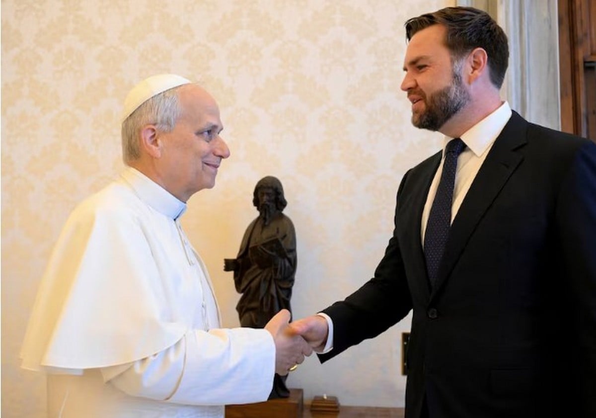 Ο Πάπας Λέων ΙΔ΄ χειραψία με τον Αντιπρόεδρο των ΗΠΑ Τζ. Ντ. Βανς κατά τη συνάντησή τους στο Βατικανό, 19 Μαΐου 2025. Vatican Media/Simone Risoluti/Handout via REUTERS