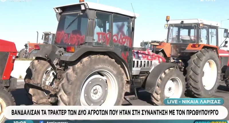 Δύο αγρότες από το μπλόκο της Νίκαιας που πήγαν χθες στη συνάντηση με τον πρωθυπουργό στο Μέγαρο Μαξίμου βρήκαν σήμερα τα τρακτέρ τους βανδαλισμένα. Είχαν γράψει με κόκκινο σπρέι τη λέξη “Προδότης”, ενώ ξεφούσκωσαν και τα λάστιχα τους.