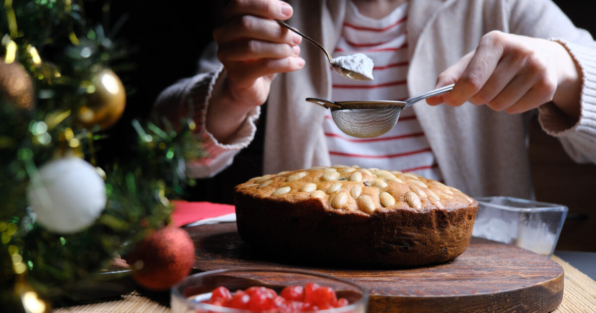 Homemade Christmas fruit cake on Holiday bokeh background, selective focus