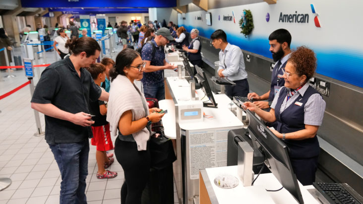 FILE – Myrna Santiago, right, a customer service agent with American Airlines, assists travelers at a ticketing gate at the Dallas Fort Worth International Airport, at DFW Airport, Texas, Nov. 21, 2025. (AP Photo/Tony Gutierrez, File)