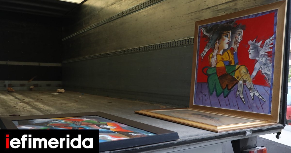 Οι αστυνομικοί φόρτωσαν τους πίνακες σε φορτηγό κατά την επιχείρηση, ενώ ακολούθησε η σύλληψη του γκαλερίστα.