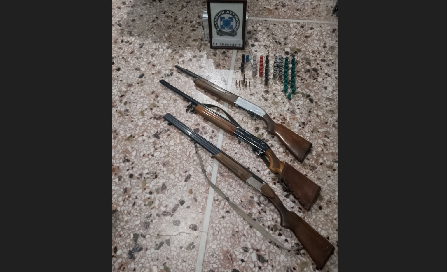 Σε έρευνες που διενεργήθηκαν στις οικίες τους βρέθηκαν και κατασχέθηκαν τρία κυνηγετικά όπλα και φυσίγγια διαφόρων διαμετρημάτων.