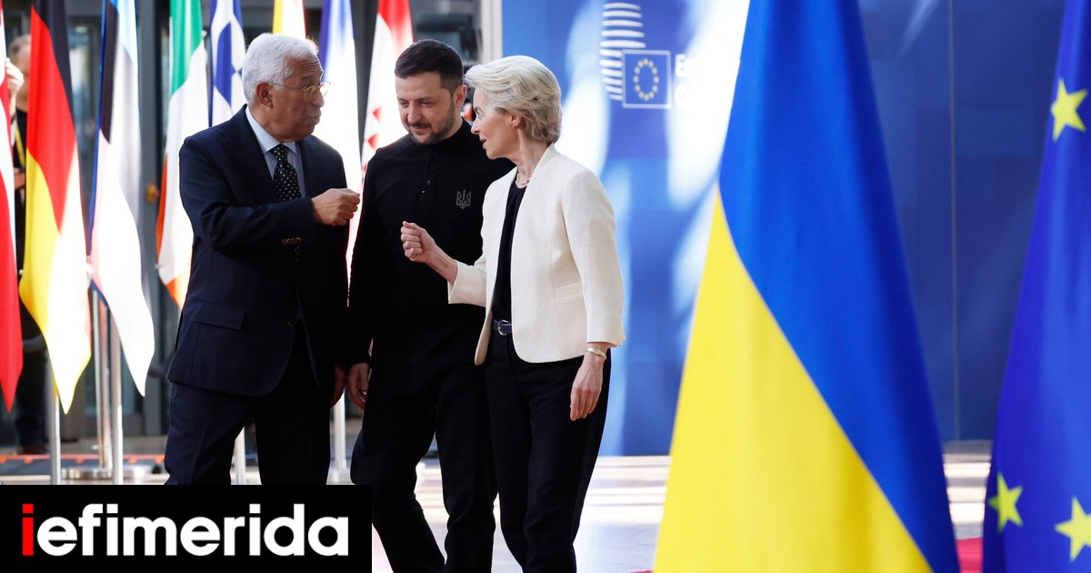 Από αριστερά, ο Πρόεδρος του Ευρωπαϊκού Συμβουλίου Αντόνιο Κόστα, ο Πρόεδρος της Ουκρανίας Βολοντίμιρ Ζελένσκι και η Πρόεδρος της Ευρωπαϊκής Επιτροπής Ούρσουλα φον ντερ Λάιεν στη Σύνοδο Κορυφής της ΕΕ / Φωτογραφία AP
